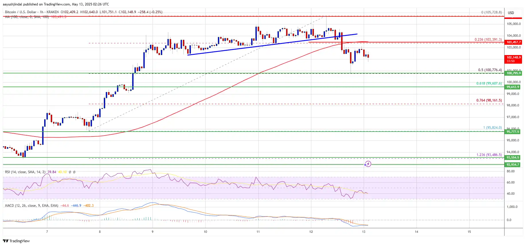Сначала все шло бодро: от зоны поддержки на $98 500 биткоин оттолкнулся, пробил психологическую отметку $100 000 и даже взломал сопротивление в $103 000. Быстро достигли $105 728, но этот максимум оказался для быков слишком тяжёлым: оттуда пошёл откат.
