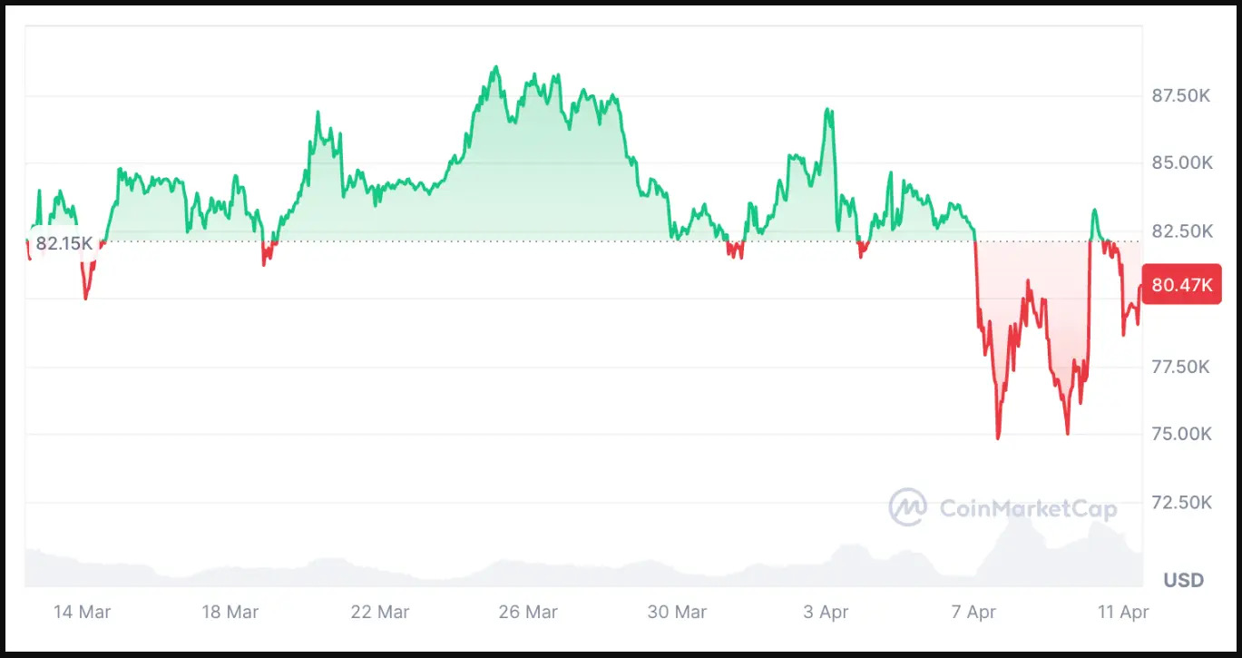 На момент написания материала биткоин торговался на отметке $79 474, потеряв за сутки 3,5%, если верить CoinMarketCap. За месяц дела тоже не ахти — минус 2,24%. Апрель вообще выдался для криптовалюты как американские горки.